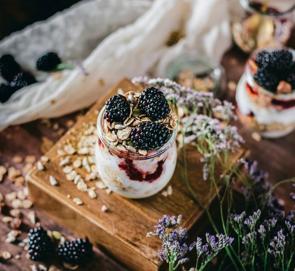 - Am Morgen Skyr und Mandelmus unterrühren und mit Beeren toppen.