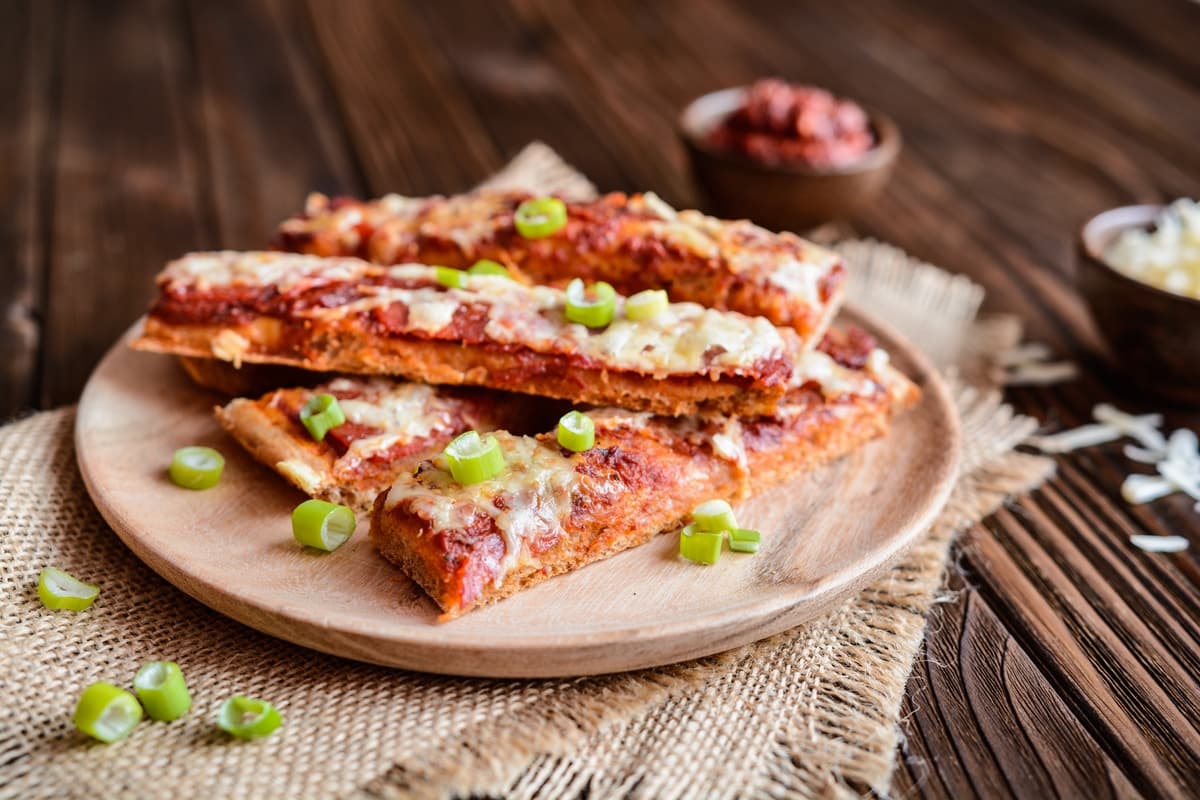 Knusprige Pizzastangen aus einfachem Dinkelmehl-Teig, bestrichen mit Tomatenmark und Käse. Perfekt als Snack für Partys, als Beilage oder für unterwegs. Einfach zuzubereiten und in nur 20 Minuten gebacken.